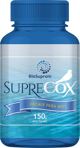 Coadjuvante do controle e tratamento da coccidiose em todas as fases de vida das aves, SupreCox é um premix solúvel de vitaminas e sais minerais com clopidol e metilbenzoquato, indicado para a hidratação rápida e manutenção da saúde de pássaros de todas as espécies, como as situações de muda, stress e preparação para torneios e reprodução. Auxilia na recuperação dos estágios de emagrecimento excessivo (sintoma: “peito seco”) causados por coccidiose, hipovitaminose e desidratação. A silimarina da sua fórmula é um poderoso protetor hepático.
