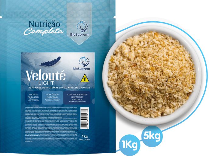 A VELOUTÉ LIGHT é uma ração completa para todos os pássaros granívoros (domésticos, nativos ou exóticos), altamente palatável, formulada especialmente para nutrir de maneira equilibrada, sem excessos. É indicada para a manutenção ideal nos intervalos entre a muda de penas e a reprodução, ou ainda para todas as fases dos pássaros que necessitem manter o score corporal sem excesso de gordura e ganho de peso, como é o caso de várias raças de canários de porte, de canto e de pássaros nativos em períodos preparatórios. Com o acréscimo de maiores níveis de protetores hepáticos e creatina, protege o metabolismo e fortalece a imunidade dos pássaros.